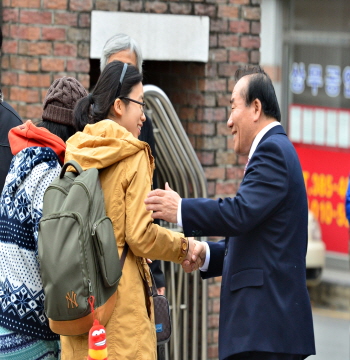 광주 교육감(장휘국), 학부모, 선후배들이 학생들에게 격력하고 있다.