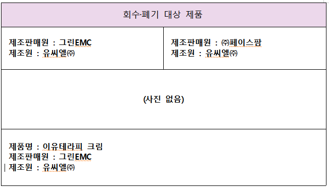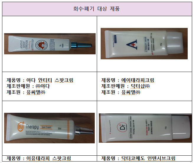 회수대상은 2011년 3월부터 2014년 10월까지 제조한 ㈜야다의 ‘야다 안티티 스팟크림’, ㈜닥터샵의 ‘에이테라피크림’, 그린EMC의 ‘이유테라피 스팟크림’과 ‘이유테라피 크림’, ㈜페이스팜의 ‘닥터코메도인텐시브크림’ 등 5개 제품이다.