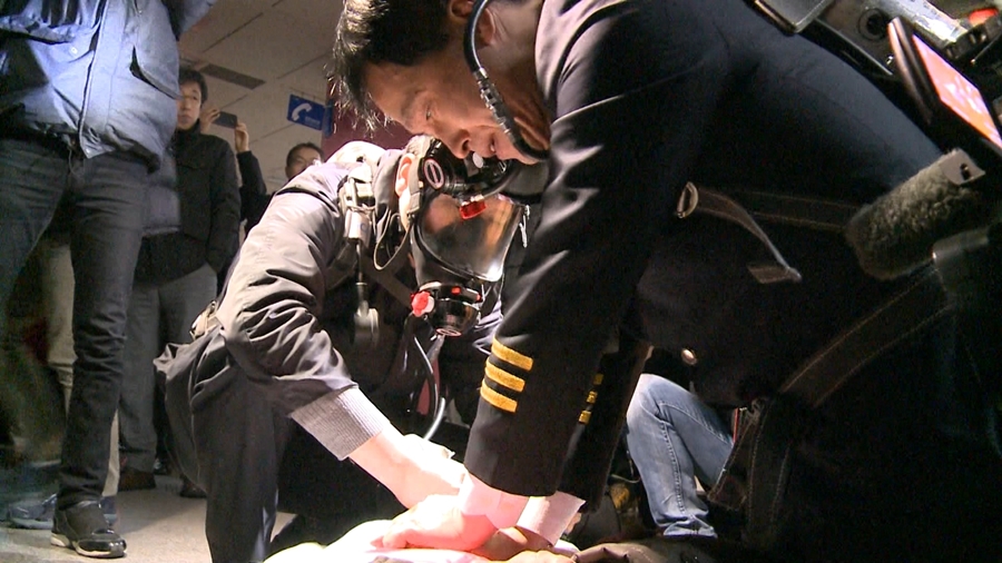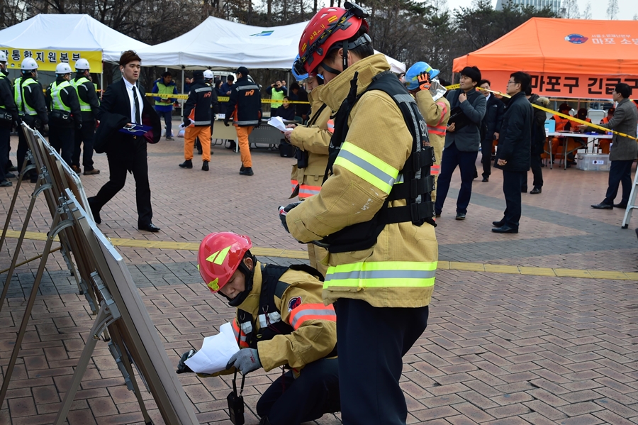 국민안전처와 서울도시철도공사 주관으로 25일 오후 마포구청역~월드컵경기장역(6호선)에서 화재진화, 승객 구조,구급, 응급의료소 운영 등 지하철 대형사고 대응 불시 현장 훈련 실시하고 있다.