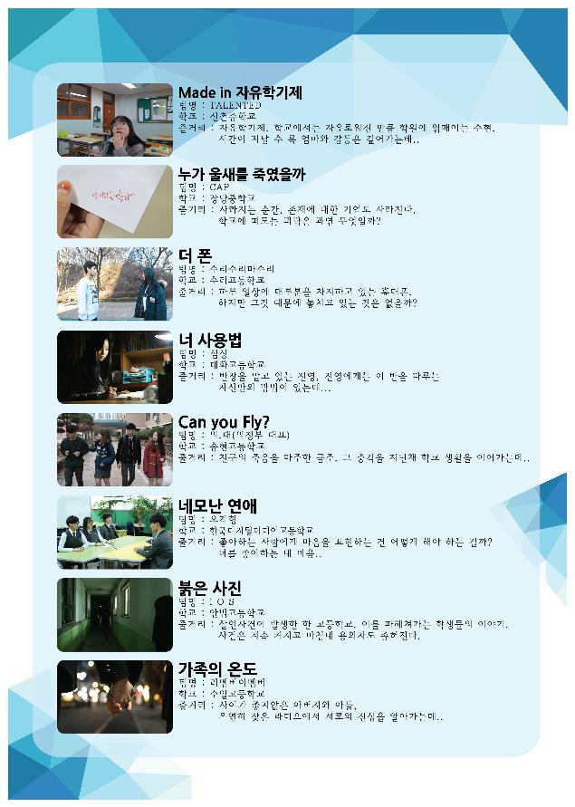 영상 작품은 자유학기제가 시작되어 시험을 벗어났다고 생각했지만 학원 공부는 더 늘어나 갈등을 겪다 학원을 벗어나 친구들과의 관계도 회복하고 서서히 자기의 꿈을 찾아가는 이야기 ‘made in 자유학기제’, 학교에서 은근히 따돌림을 당하고 있는 친구와 반장의 통제 모습을 그린‘너 사용법’, 친구의 자살에 마음을 닫은 금주와 마음을 열어가는 선생님과 친구들의 이야기‘Can you Fly?’, 성적 문제로 사이가 좋지 않은 아버지와 아들이 서로의 진심을 알아가는 이야기‘가족의 온도’등 8편이 상영 될 예정이다.